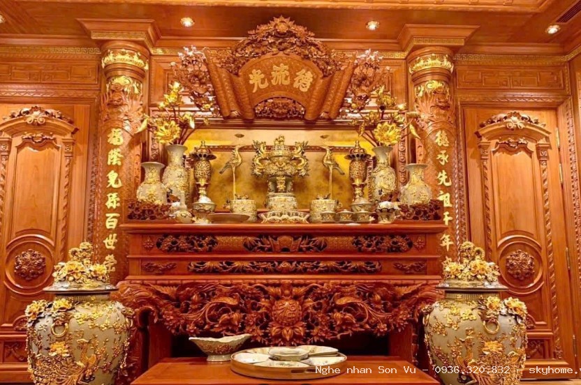 Nghệ nhân Sơn Vũ trực tiếp thổi hồn vào từng đường nét hoa văn trên nền gỗ Gỗ Mít, đảm bảo chuẩn phong thủy Lỗ Ban.