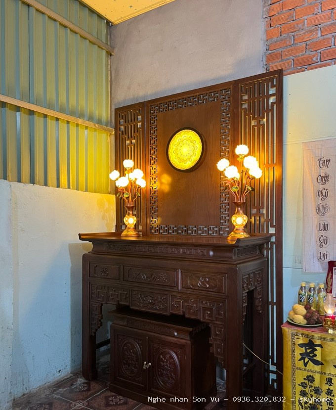 Bàn thờ đứng gỗ Sồi đỏ mẫu chiện sen tại Thanh Xuân