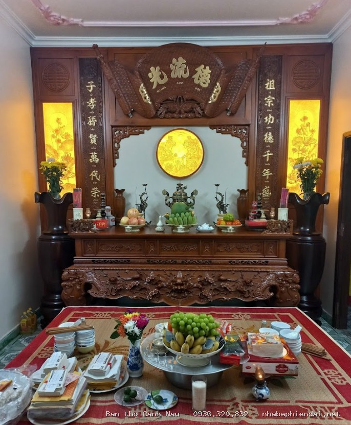 Bàn thờ đứng đơn giản chạm ngũ phúc và bộ đồ thờ, hoa sen gỗ tại Thanh Xuân